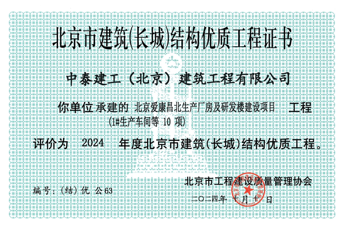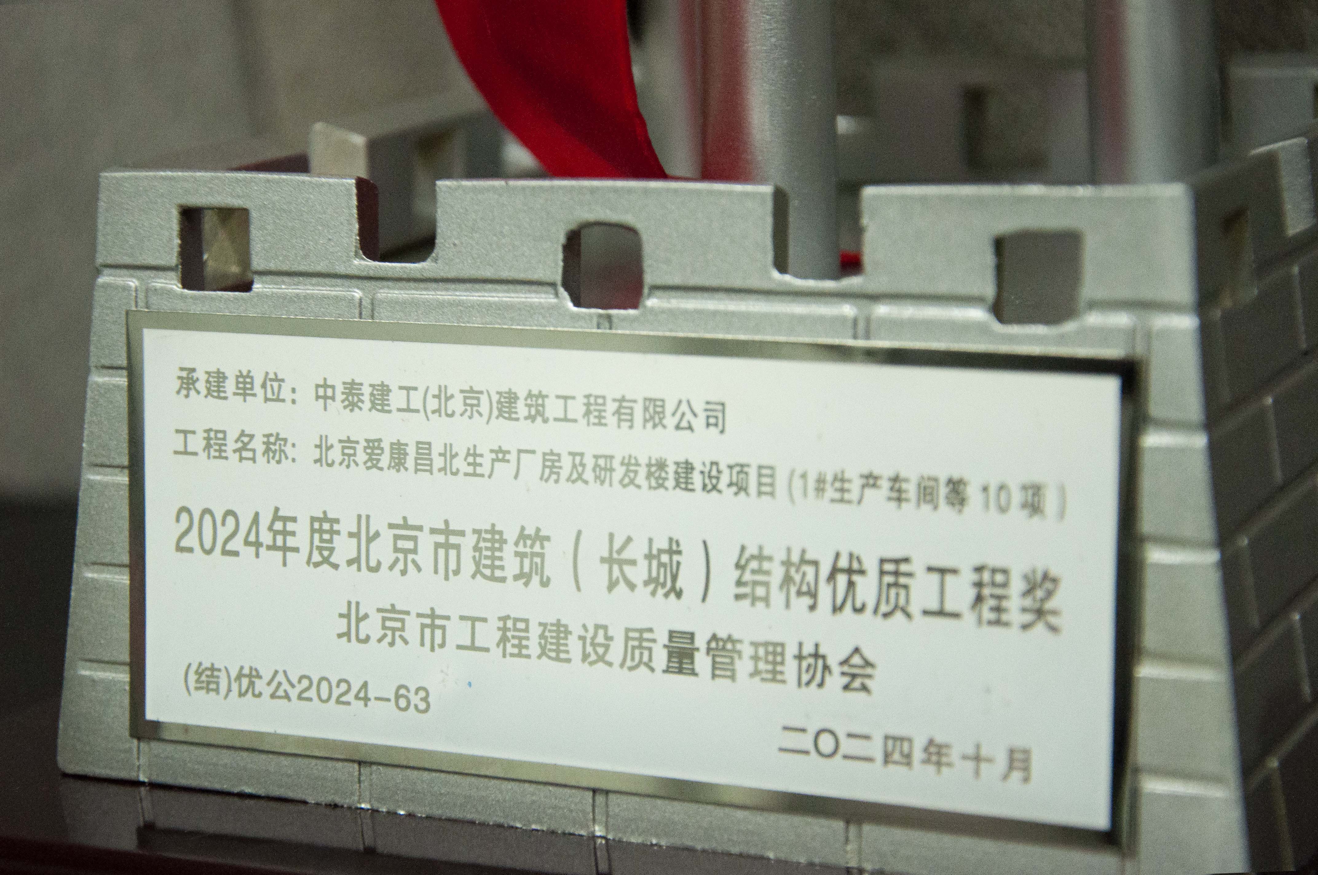 由中泰建工(北京)建筑工程有限公司承建的北京愛康昌北生產(chǎn)廠房及研發(fā)樓建設項目,榮獲市級“北京市建筑(長城)結(jié)構優(yōu)質(zhì)工程獎”。
